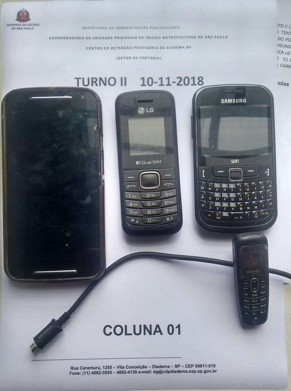 A Secretaria da Administração Penitenciária informa que no sábado, 10, os agentes de escolta do Centro de Detenção Provisória (CDP) de Diadema interceptaram a entrada de celulares e acessórios que seriam jogados através do muro.
