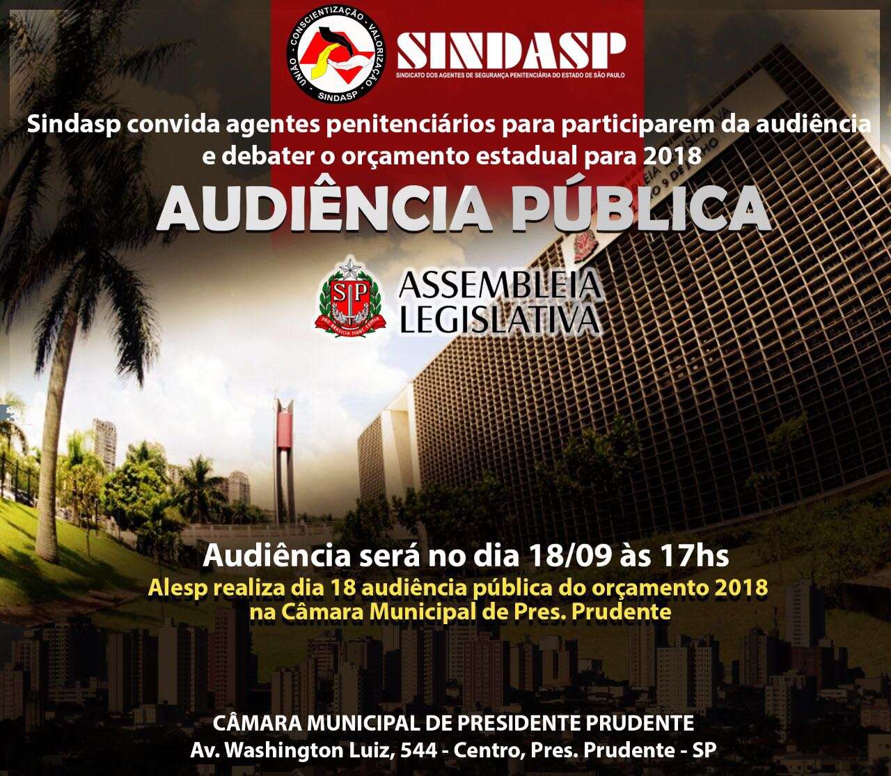 A Assembleia Legislativa do Estado de São Paulo (Alesp) realiza na próxima segunda-feira (18), na Câmara Municipal de Presidente Prudente, uma audiência pública com o objetivo de ouvir as demandas da sociedade e debater o Orçamento Estadual para 2018. De acordo com a programação da Alesp, a audiência será às 17h.