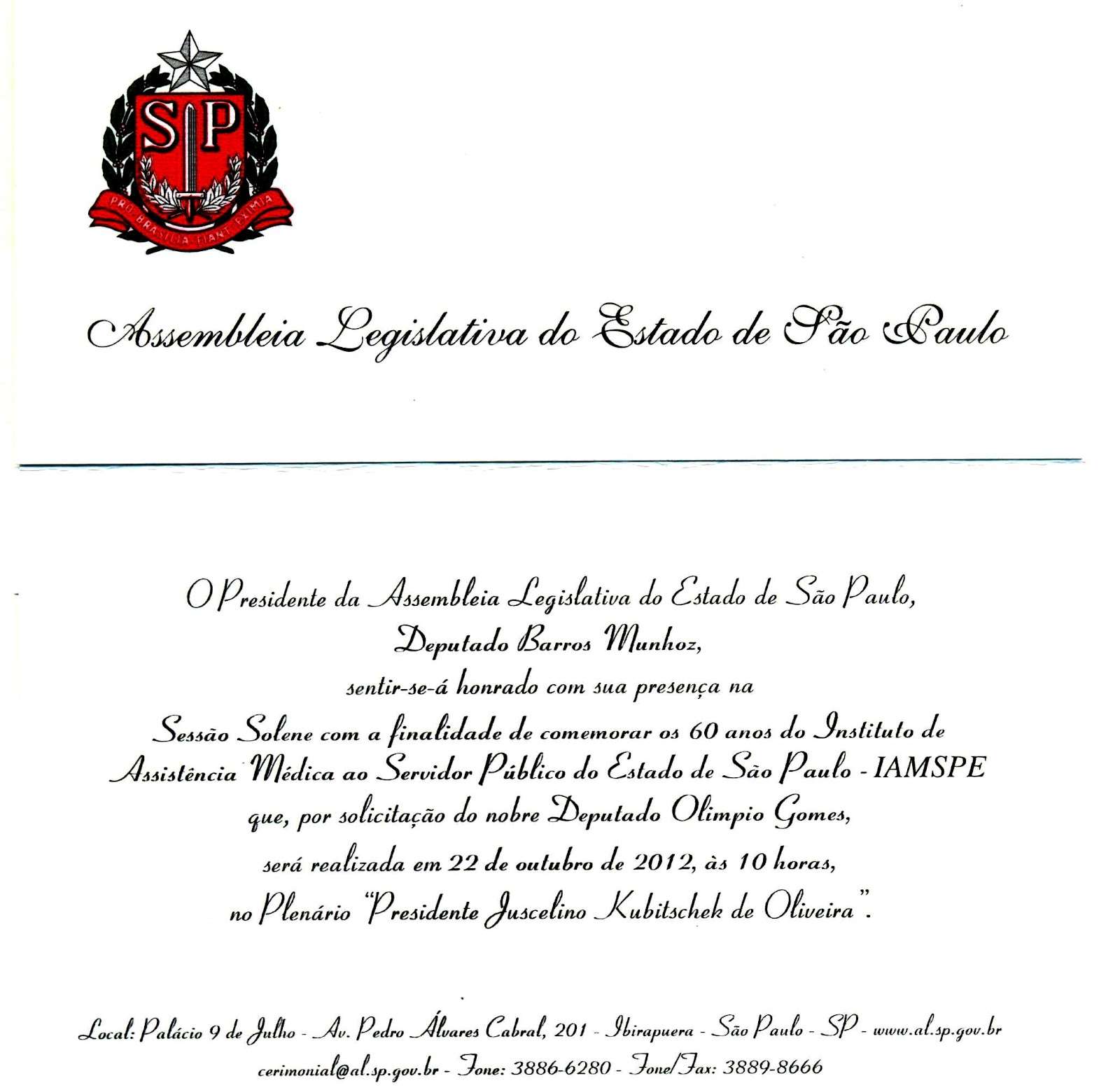 aPor iniciativa do deputado estadual Major Olímpio Gomes (PDT/SP), a Assembleia Legislativa do Estado de São Paulo realizará uma cerimônia de comemoração dos 60 anos do Instituto de Assistência Médica ao Servidor Público Estadual (Iamspe). O evento será realizado no Plenário Juscelino Kubitschek do Legislativo Paulista, no dia 22 de outubro, às 10 horas da manhã.
