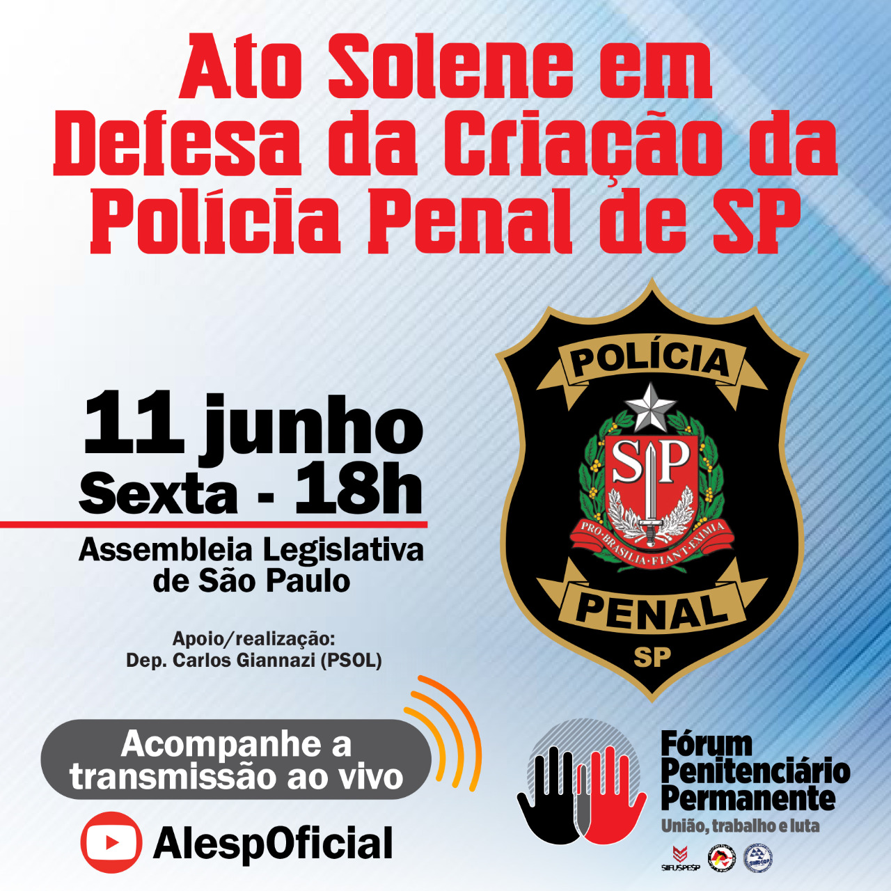 Neste 11 de junho (sexta-feira), a partir das 18h, tem Ato Solene em Defesa da Criação da Polícia Penal paulista, em sessão virtual da Assembleia Legislativa de São Paulo, com transmissão ao vivo pelo canal da Alesp no YouTube. A iniciativa é do deputado estadual Carlos Giannazi (PSOL) e terá a participação de representantes dos SIFUSPESP, sindppesp e SINDCOP, que integram o Fórum Penitenciário Permanente, além de outros parlamentares.