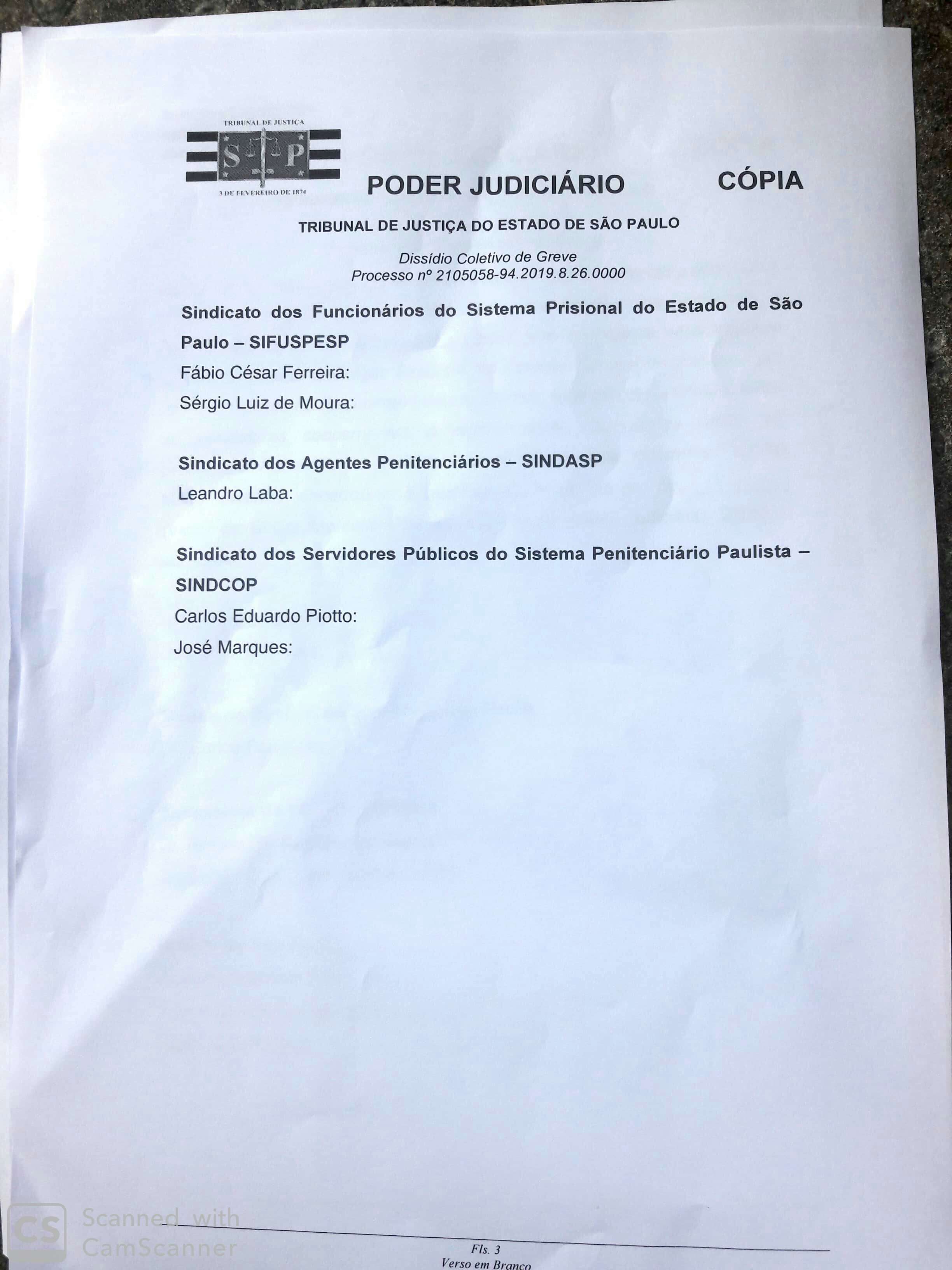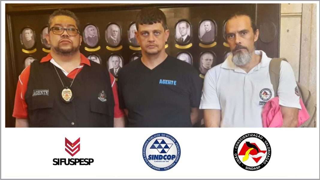 Participaram da audiência o presidente do Sifuspesp, Fábio Cesar Ferreira, o Jabá, o diretor do sindppesp-SP da sede da Capital, Leandro Laba, e o diretor do Sindcop, Carlos Eduardo Piotto. Os advogados do Sifuspesp, Sérgio Luiz de Moura, e do Sindcop, José Marques, participaram da audiência.