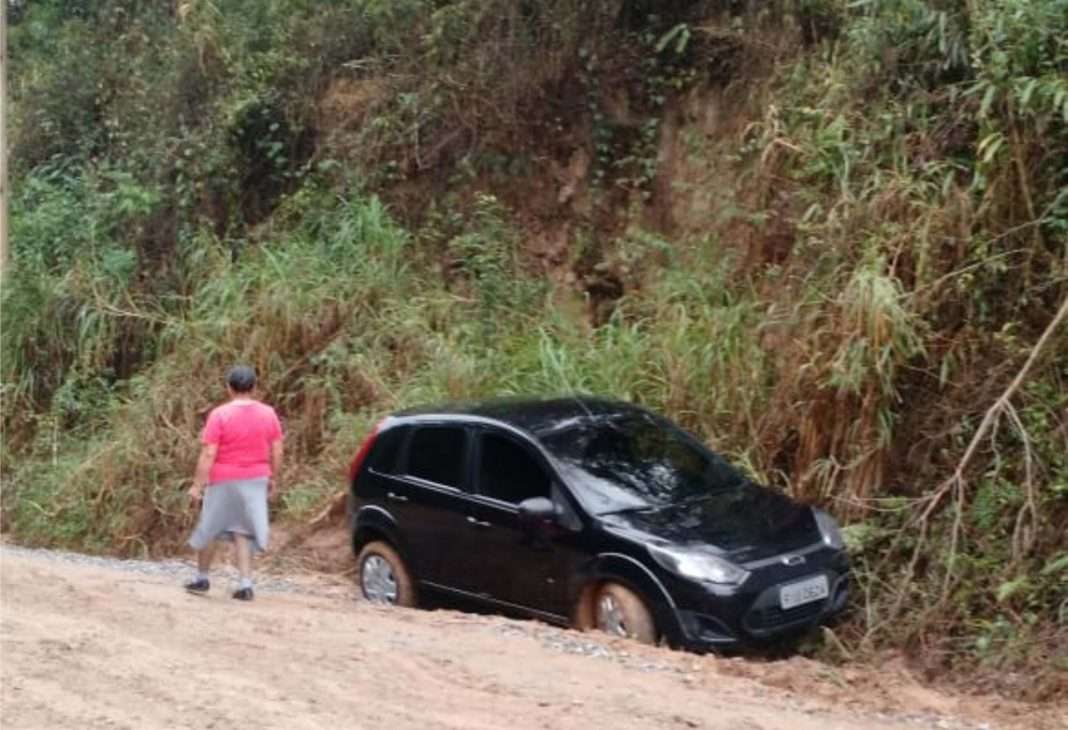 Carro derrapa e cai em valeta na estrada sem asfalto da Penitenciária de Mairinque