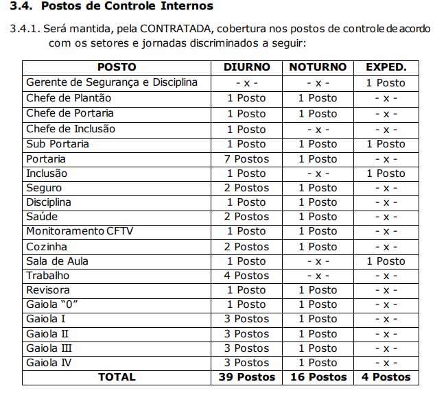 O documento relata que os serviços de vigilância e segurança externa, ocupação das guaritas e muralhas das unidades prisionais, serão de competência do contratante, e realizada pelos agentes de escolta e vigilância penitenciária (AEVP).