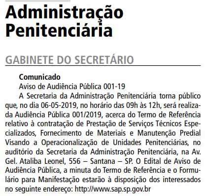 De acordo com um comunicado publicado no Diário Oficial pelo gabinete do secretário da Administração Penitenciária, Nivaldo Restivo, acontece no próximo dia 6/5, às 9h, uma audiência pública visando a contratação de empresa especializada para operar quatro unidades prisionais, em cogestão com a Secretaria da Administração Penitenciária (SAP).