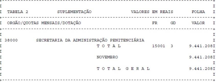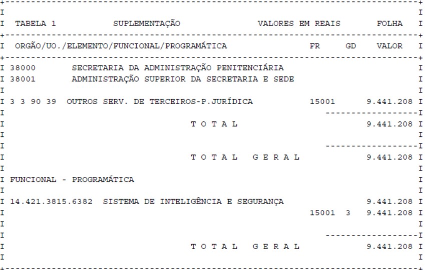 Artigo 1° – Fica aberto um crédito de R$ 9.441.208,00 (nove milhões, quatrocentos e quarenta e um mil, duzentos e oito reais), suplementar ao orçamento da Secretaria da Administração Penitenciária, observando-se as classificações Institucional, Econômica, Funcional e Programática, conforme a Tabela 1, anexa.