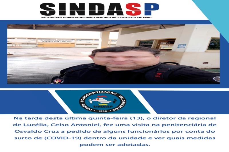 Na tarde desta última quinta-feira (13), o diretor da regional de Lucélia, Celso Antoniel, fez uma visita na penitenciária de Osvaldo Cruz a pedido de alguns funcionários por conta do surto de (COVID-19) dentro da unidade e ver quais medidas podem ser adotadas no momento em que estão passando.