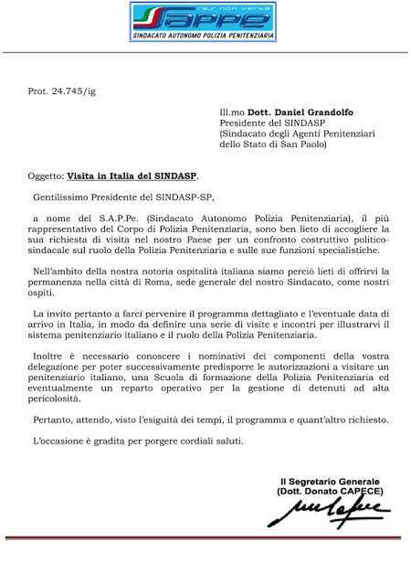 De acordo com o convite, a delegação do sindppesp-SP terá permissão para visitar as penitenciárias italianas, uma escola de formação da Polizia Penitenziaria, um departamento operacional para a gestão de prisioneiros perigosos e líderes do governo italiano.