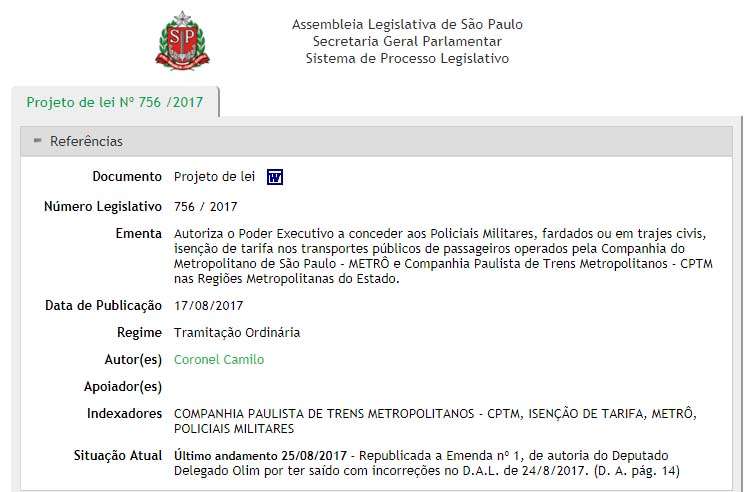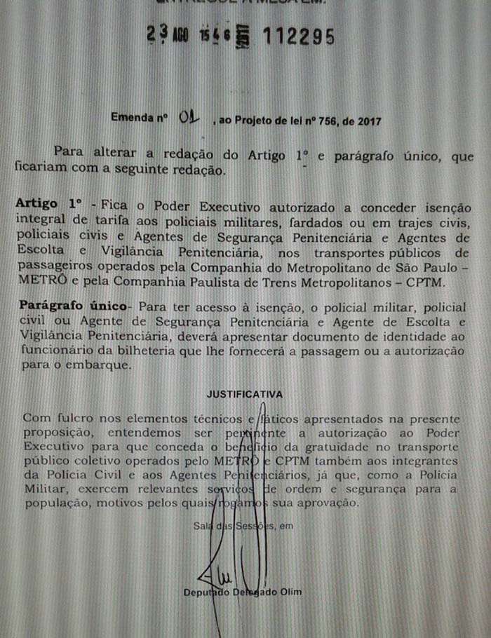 Uma emenda do deputado estadual delegado Olim, insere os agentes de segurança penitenciária (ASP), no Projeto de lei 756/17, que concede aos policiais militares, fardados ou em trajes civis, a isenção de tarifa nos transportes públicos operados pela Companhia do Metropolitano de São Paulo (METRÔ) e Companhia Paulista de Trens Metropolitanos (CPTM), nas Regiões Metropolitanas do Estado.
