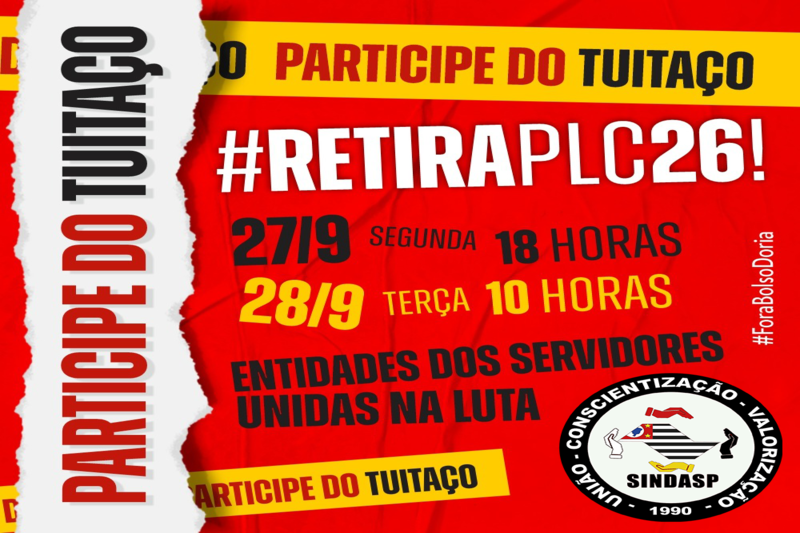 Hoje (27/09) haverá uma movimentação no twitter às 18 horas, horário de Brasília, para a retirada do Projeto de Lei Complementar 26/2021, encaminhado pelo Governador João Doria à Assembleia Legislativa do Estado (Alesp).