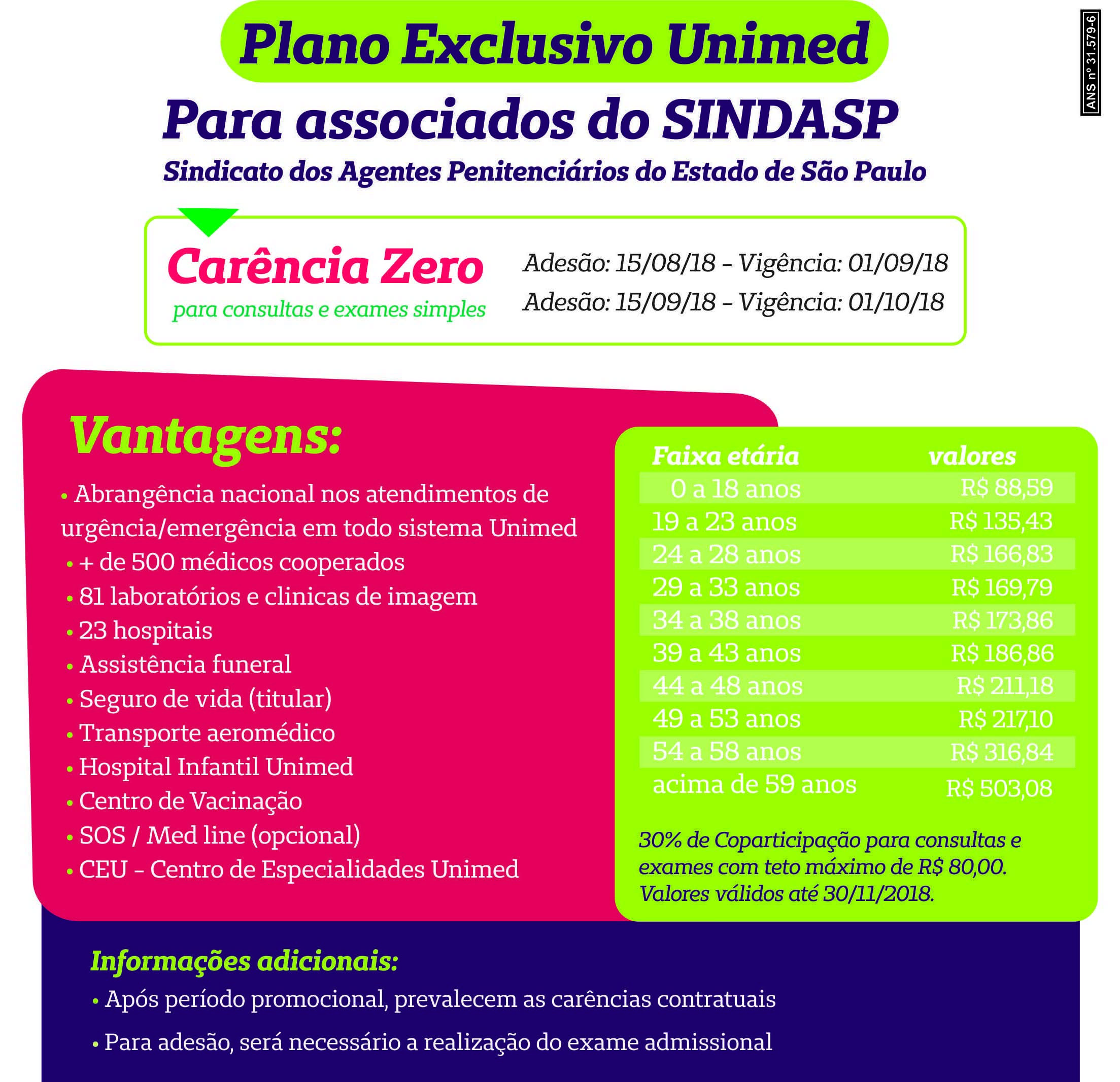 A Unimed oferece aos filiados do sindppesp-SP e seus dependentes as seguintes vantagens e mensalidades, conforme a faixa etária em que cada um se enquadra. Veja tabela abaixo.