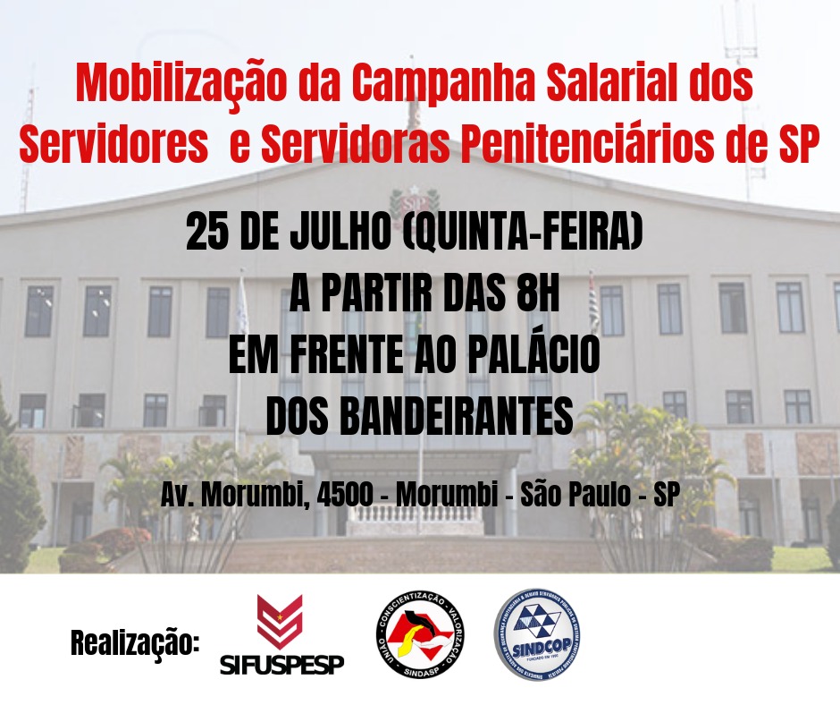 Na luta por avanços concretos na campanha salarial, o Fórum Penitenciário Permanente está convocando os servidores e as servidoras penitenciários a participar de uma mobilização no próximo dia 25 de julho (quinta-feira), com concentração a partir das 8h, em frente ao Palácio dos Bandeirantes. Criado para somar forças em defesa da categoria, o Fórum é uma iniciativa que reúne o Sindicato dos Funcionários do Sistema Prisional do Estado de São Paulo (SIFUSPESP), o Sindicato dos Agentes de Segurança Penitenciária do Estado de São Paulo (sindppesp) e o Sindicato dos Agentes de Segurança Penitenciária e Demais Servidores Públicos do Sistema Penitenciário Paulista (SINDCOP).