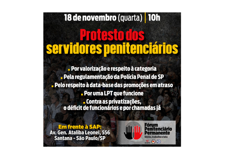 Convocando todos os servidores e servidoras do sistema prisional a participar, as principais reivindicações do Fórum são pela valorização e respeito à categoria; pela regulamentação da Polícia Penal paulista; pelo respeito à data-base das promoções, que estão em atraso; pelo estabelecimento de listas de transferência que funcionem.