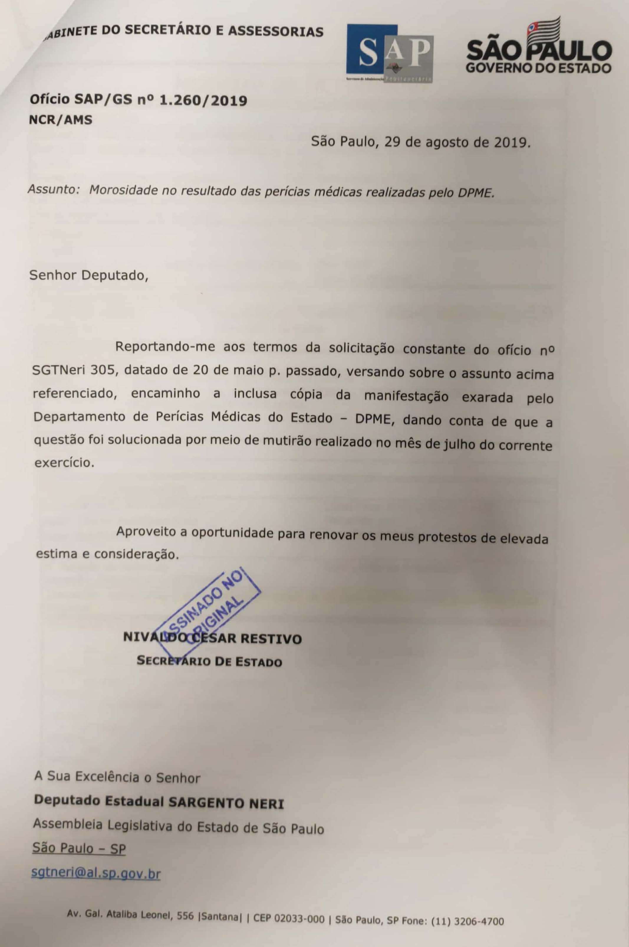 A pedido do diretor Administrativo da Regional do sindppesp-SP em Marília, Luciano Novaes Carneiro, no último mês de maio, o deputado estadual sargento Neri (AVANTE), protocolou um requerimento junto ao secretário de Estado da Administração Penitenciária, Nivaldo Restivo, cobrando a agilidade na publicação dos resultados das perícias médicas realizadas pelo DPME (Departamento de Perícias Médicas do Estado).