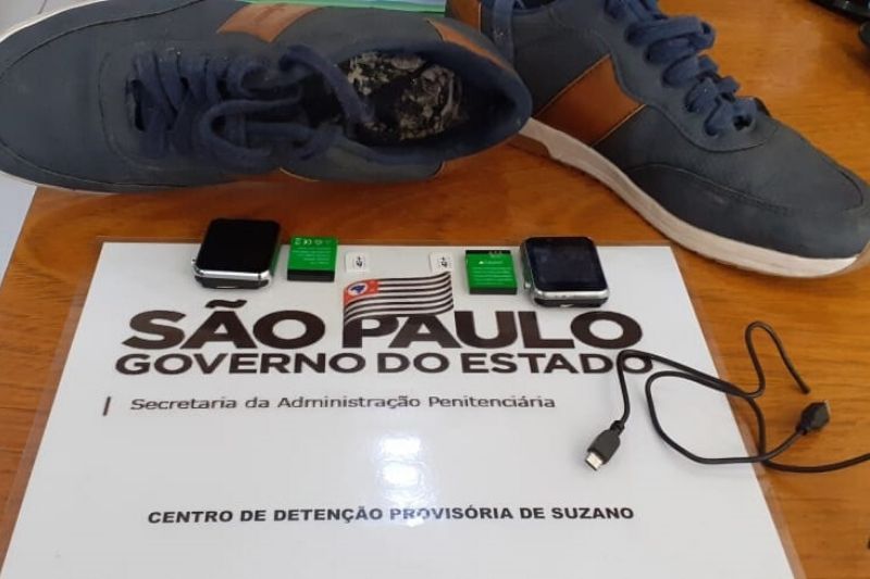 Na outra, encaminhada pela companheira de um preso, havia dois relógios inteligentes (smartwatches) escondidos na sola de um tênis, onde também foram encontrados dois chips telefônicos, duas baterias e dois cabos USB.