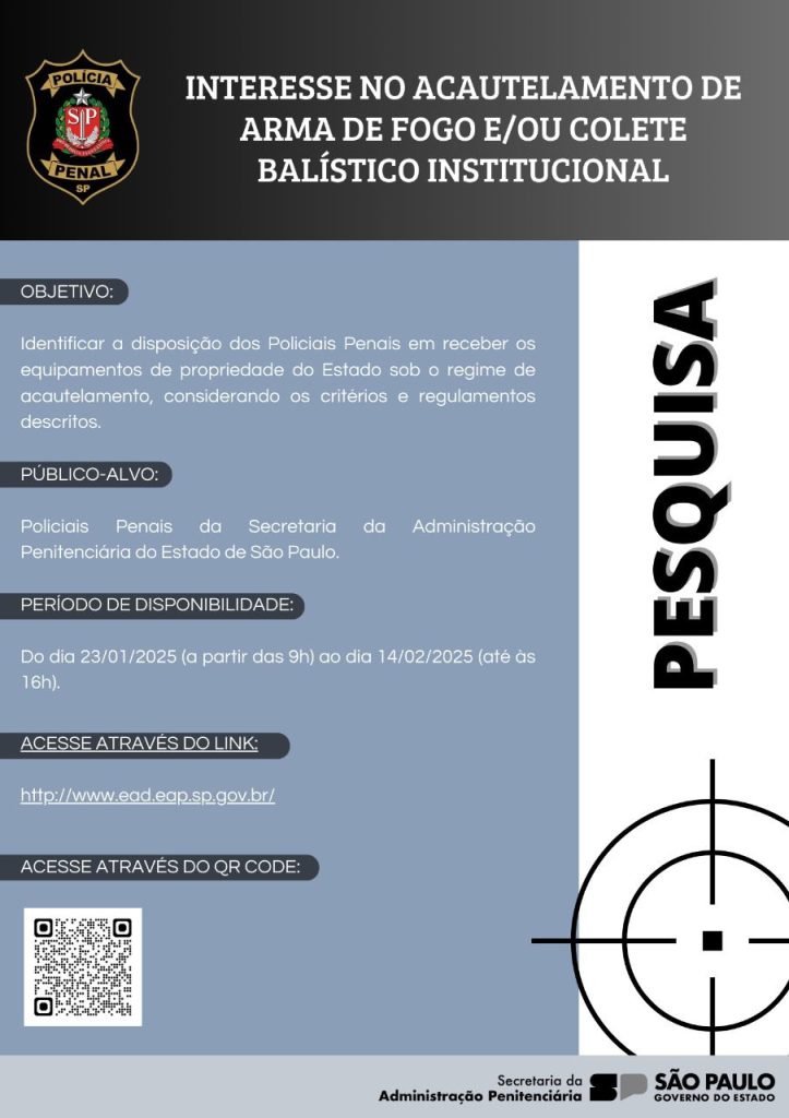 - Sua contribuição é essencial para que possamos aprimorar as políticas de gestão de equipamentos e segurança na Polícia Penal do Estado de São Paulo.