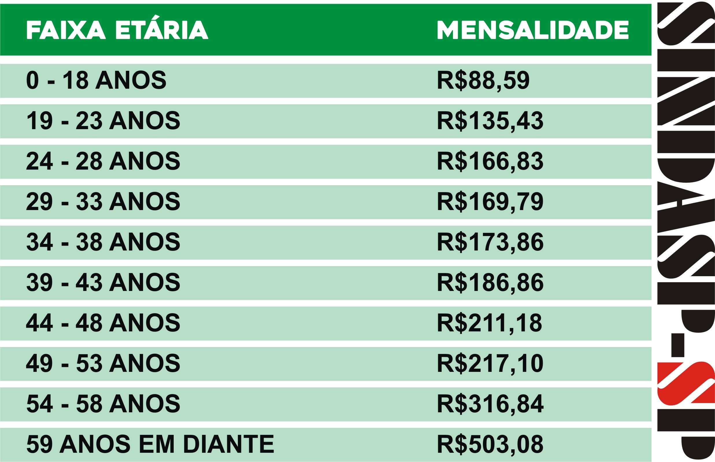 A Unimed oferecerá aos filiados do sindppesp-SP e seus dependentes as seguintes mensalidades, conforme a faixa etária em que cada um se enquadra. Veja tabela abaixo.