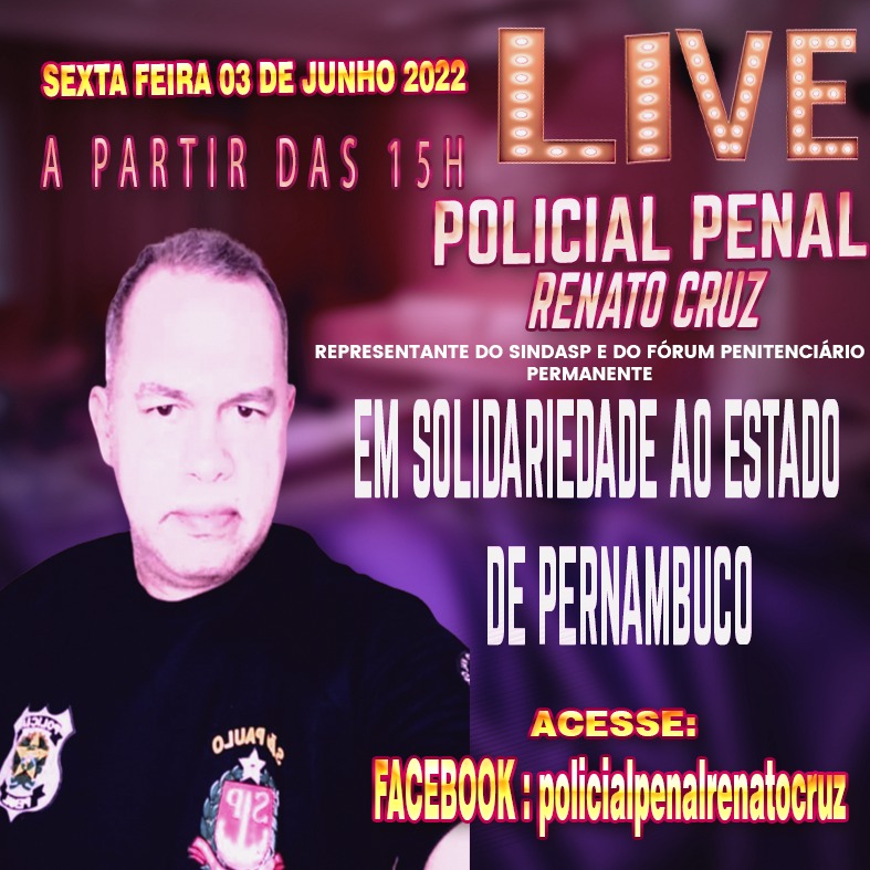Renato Cruz, representante do Sindicato dos Agentes de Segurança Penitenciária do Estado de São Paulo/Policiais Penais (sindppesp-SP) e do Fórum Penitenciário Permanente, vai estar em um live na sexta-feira (03), para demonstrar solidariedade ao estado de Pernambuco que vem sofrendo nesses últimos dias com as fortes pancadas de chuvas em algumas regiões.