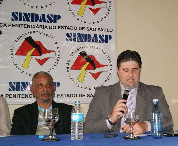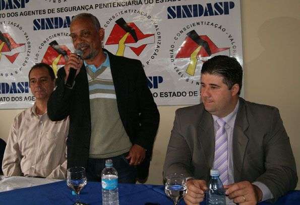 Deputado estadual Ed Thomas, se dirigindo ao presidente Daniel Grandolfo, elogiando o papel do sindppesp-SP e falando da importância da instituição enquanto representante da categoria junto ao governo