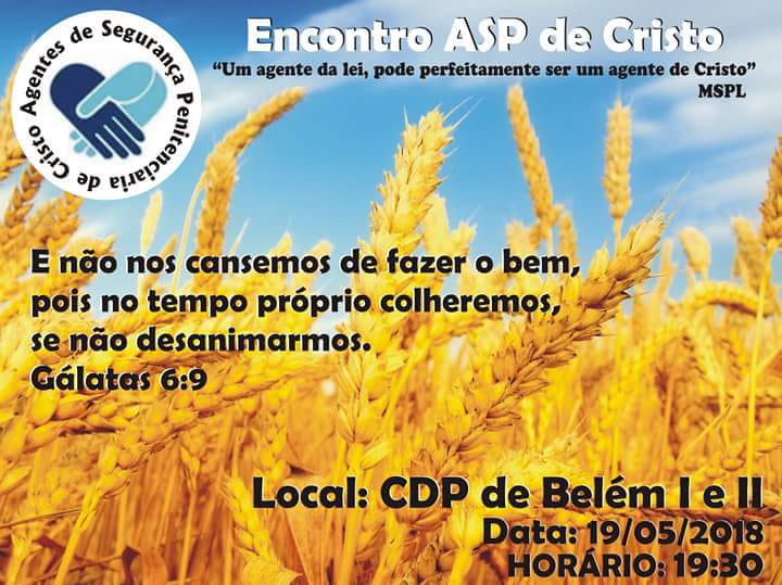 Geral sindppesp apoia encontro ASP de Cristo nos CDPs de Belém I e II Por Assessoria de Imprensa - 17 de maio de 2018 0 49 No próximo dia 19 acontece o “Encontro ASP de Cristo” nos Centros de Detenção Provisória (CDPs) I e II de Belém. O encontro terá início às 19h30 e conta com o apoio do sindppesp-SP. Participe!