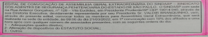 O sindppesp-SP na figura de seu Presidente senhor Valdir Branquinho, nos termos da legislação vigente, convoca seus filiados para uma Assembleia Geral Extraordinária (AGE), que será realizada no dia 21 de março de 2022, às 09h00 em primeira convocação com 10% dos filiados e uma hora depois com qualquer número de associados, na sede do sindppesp (Sindicato dos Agentes de Segurança Penitenciária do Estado de São Paulo), localizado na rua Antenor Gonçalves, 128, Vila Euclides de Presidente Prudente-SP. A convocação foi publicada no jornal “Folha de São Paulo” de sexta-feira (18) de março 2022.