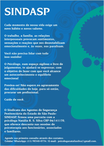 A sede regional do sindppesp-SP da Capital firmou mais uma parceria de convênio para atender aos filiados da instituição, dependentes e funcionários. A nova parceria é com a psicoterapeuta Natália Regina dos Santos Silva. O contrato foi assinado entre a psicoterapeuta e a Diretora Administrativa da sede da Capital, Kathiane de C.M.R. Silva.