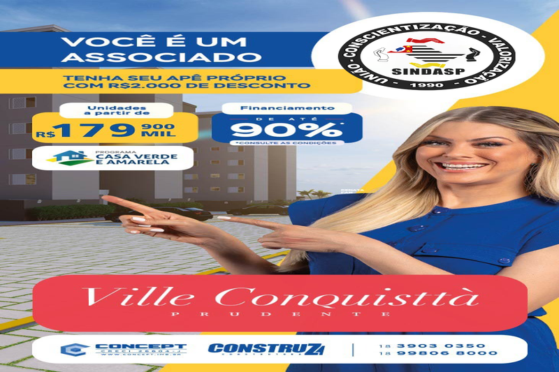 A parceria é para o empreendimento Ville Conquisttà, em Presidente Prudente. A Construtora oferece descontos nos valores dos imóveis, à vista ou a prazo, de R$2.000,00 sobre o valor do contrato. É necessário comprovar a filiação ao sindppesp-SP para ter direito ao desconto.