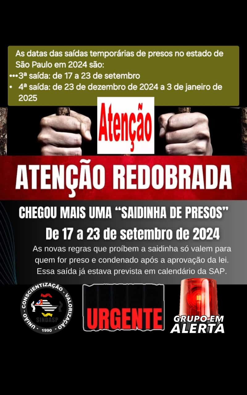 Atenção redobrada de todos, chegou o período de mais uma saidinha de presos, de 17 a 23 de setembro de 2024 vai ter um grande número de detentos nas ruas e todos devem estar atentos.